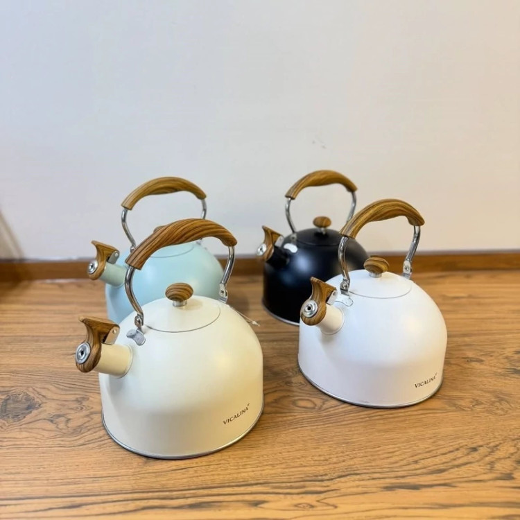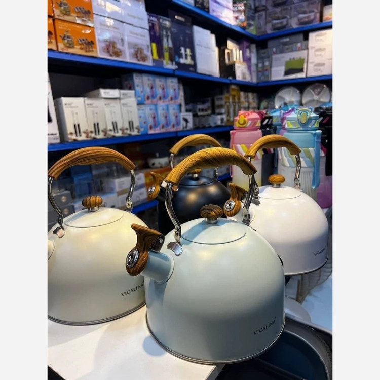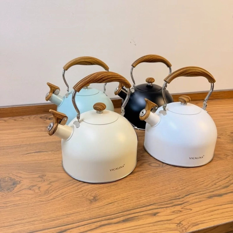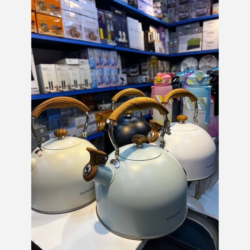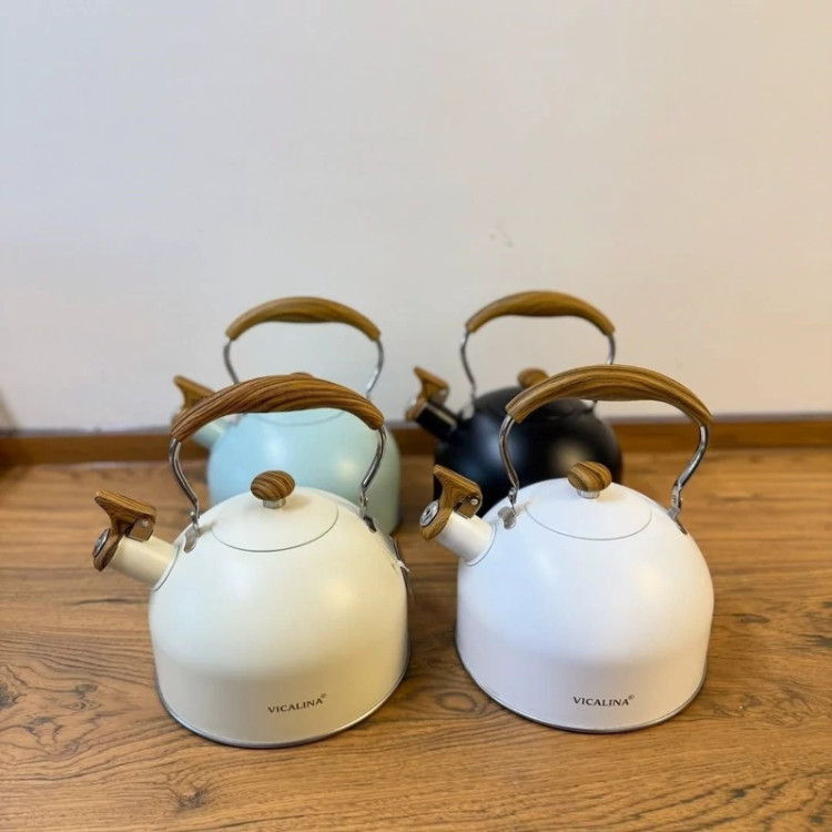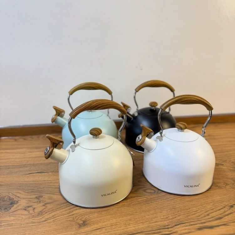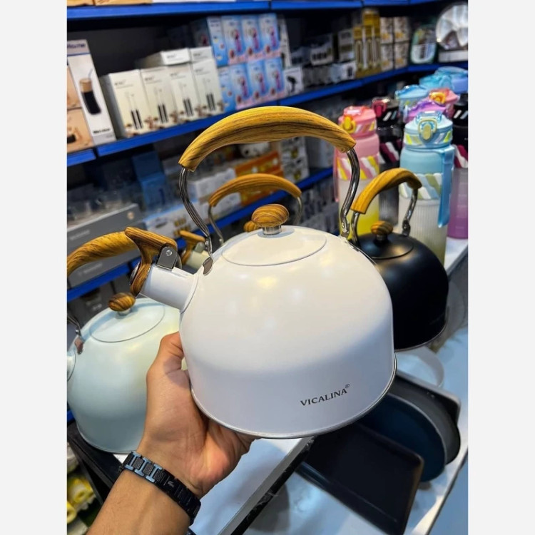 شارژ مجدد 😍😍😍 ❌ارسال رنگ شانسی ❌درصورت انتخاب رنگ استعلام موجودی کنید کتری سوت زن Vicalina محصول وارداتی 🇨🇳 کیفیت بسیار عالی جنس استیل رنگ ثابت جنس بدنه لعابی با کیفیت دسته چوبی متحرک حجم : 2,5 لیتری موجود در 4 رنگ (سفید،مشکی،کرم، آبی)