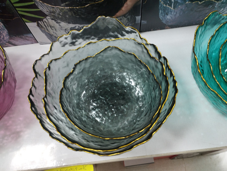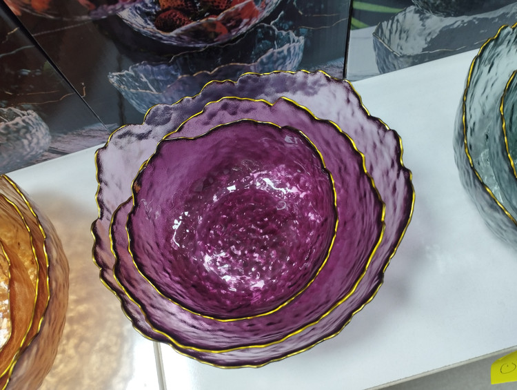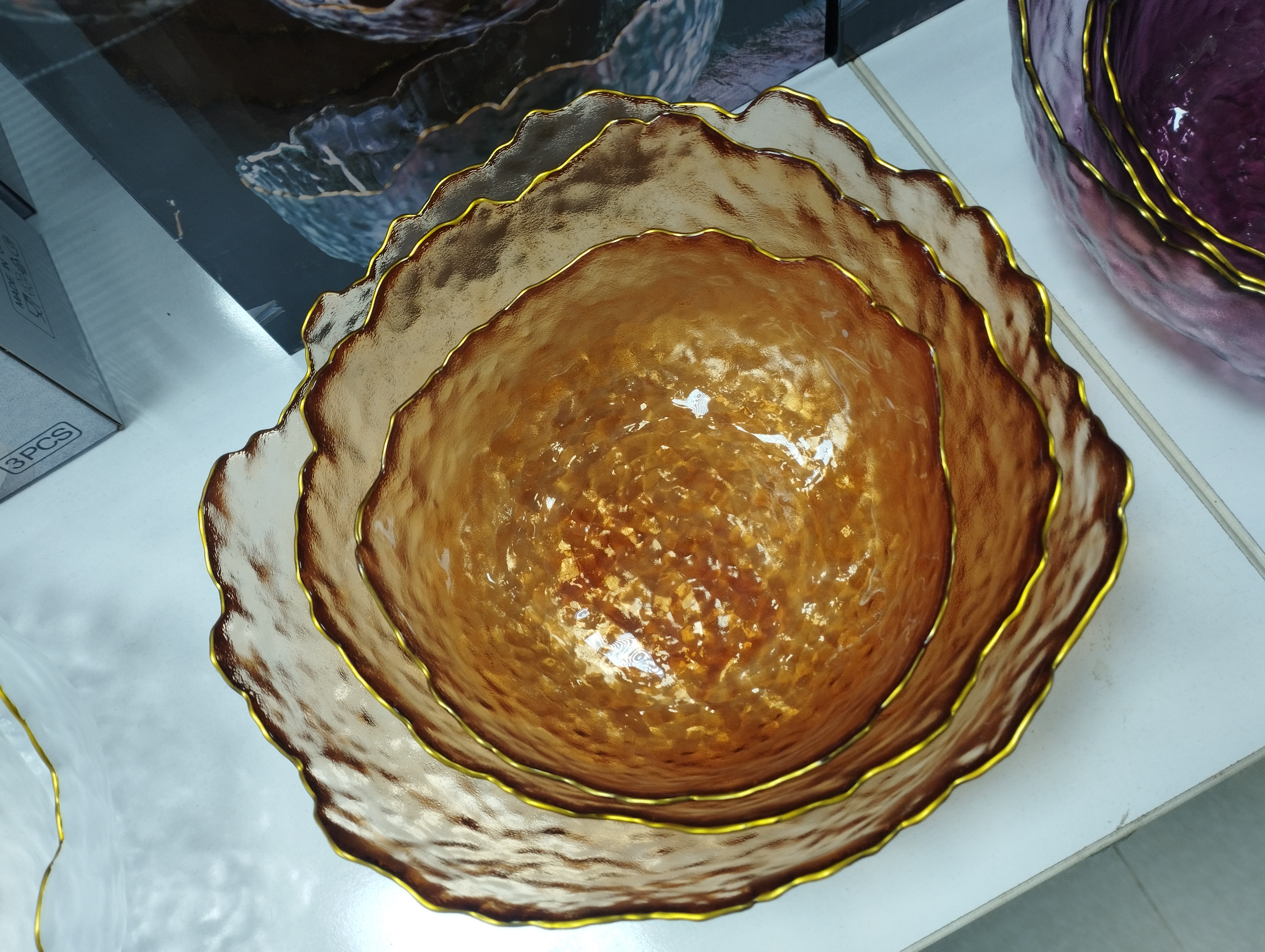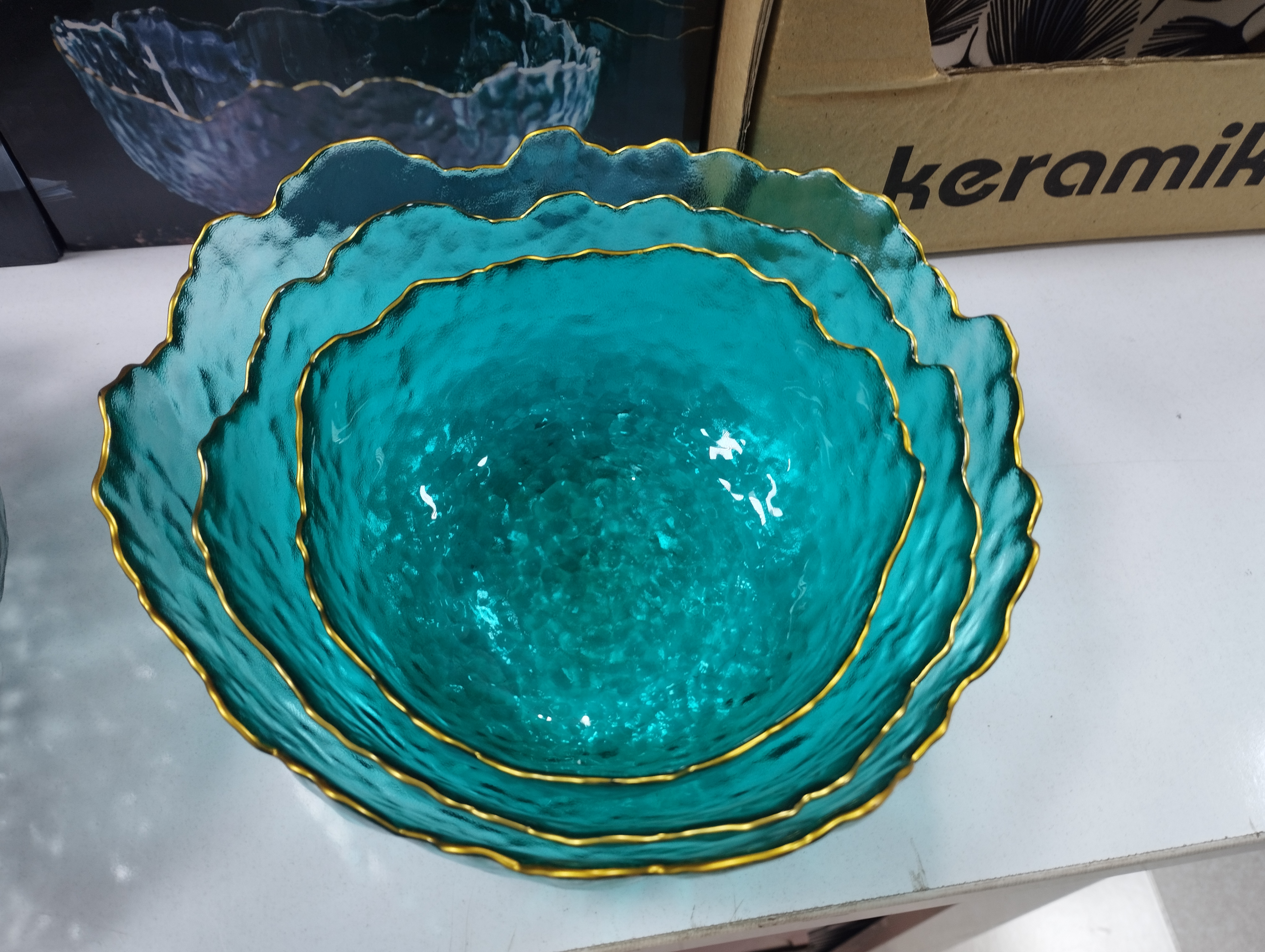 کاسه و پیاله دفرمه 3تایی در همه رنگها شارژ شد 😍 ✅ بی رنگ ساده ✅ بی رنگ لب طلا ✅رنگی لب طلا : ابی ،سبز ،دودی ،صورتی ✔️وارداتی و کیفیت عالی ✔️جنس بلور دست ساز ✔️ابعاد سایز 1 قطر 20 عمق 9 سانتیمتر ✔️ابعاد سایز 2 قطر 16 عمق 8 سانتیمتر ✔️ابعاد سایز 3 قطر 13 عمق 6 سانتیمتر
